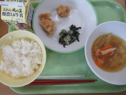 鶏肉のから揚げは、外はサクサク、中はとてもジューシーでした。冬瓜の吉野煮は、汁にとろみがついていて、また甘く、野菜もとろけそうなほど柔らかく、味が染みていて、おいしかったです。 給食委員長 出戸