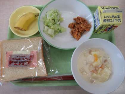 食パン 牛乳 メープルジャム ポークチャップ かぶシチュー そえ野菜 バナナ