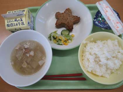 ごはん 星形ハンバーグ コーンサラダ 天の川スープ 七夕デザート