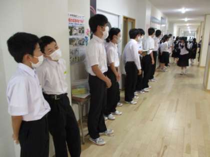 今朝は登校時、雨になっていました。あいさつ運動は卓球部男子が廊下で行っていました。今日の下校完了時間は17:00です。