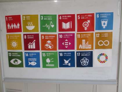 A棟2階の2年生の廊下には意識を高めるためにSDGsの17の目標が掲示されています。