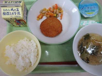 今日は、選択献立でした。魚のカレー揚げは、魚が柔らかく、カレーの風味があり、ごはんに合いました。ハムチーズフライは、ハムとチーズの相性がよく、外は、サクッとしていて、おいしかったです。ソーダゼリーは、ソーダの味が強く、蒸し暑い今日にぴったりの冷たさでした。シークワーサータルトは、甘酸っぱく、タルトがサクサクしていて、おいしかったです。