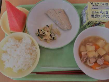 ごはん 牛乳 はりはり和え 鰆の塩焼き 肉じゃが すいか