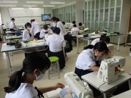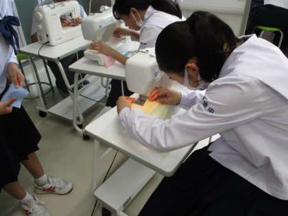 5限の27Hの家庭科の授業の様子です。裁縫を学んでいます。ミシンの使い方も練習していました。