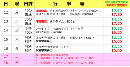※月曜日と火曜日の日課が入れ替わっています。生徒の皆さんは、時間割をしっかりと確認しましょう。お家の方には、お子様への声かけ(日課の入れ替え)をお願いします。