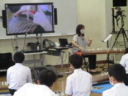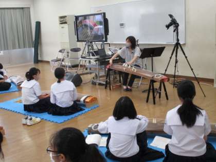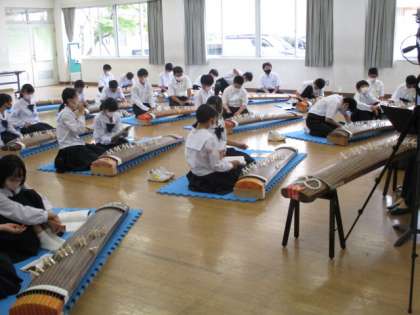 3限、A多目的室で16Hの琴の音楽の授業が行われていました。16Hは琴の授業は今日で2回目です。