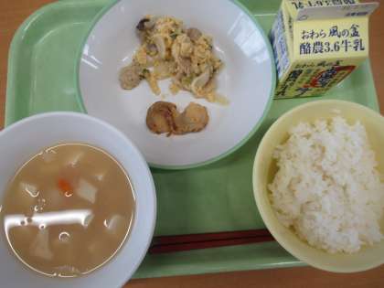 ごはん 牛乳 ゴーヤの卵炒め ほたての香味焼き 白玉汁