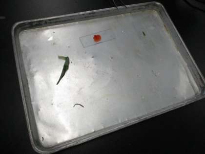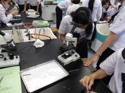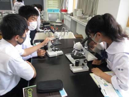 観察はオオカナダモの葉やツユクサノの葉に加え、川の水を使ってゾウリムシなどの生物も確認していました。