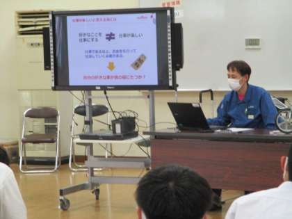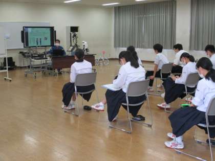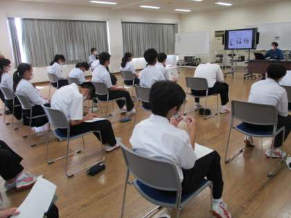 2年生は午後から、「14歳の学び『世界は誰かの仕事でできている』」と題して、様々な職種の人をお招きし、職業に関する話を聴きました。生徒は14の講座の中から関心のある2つの講座を選び、参加します。写真は富山村田製作所さんの講座の様子です。