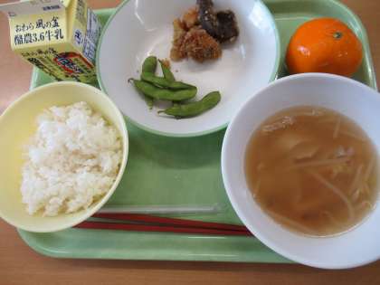 枝豆は、塩味がきいていて、おいしっかたです。冷凍みかんは、とても冷たく、暑い今日にぴったりでした。 給食委員長 出戸