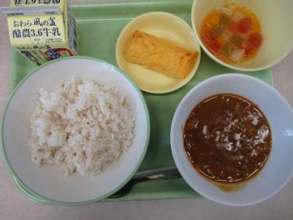 麦ごはん 牛乳 カレールウ 卵ロール フルーツカクテル