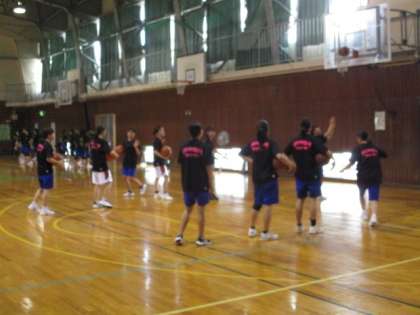 体育館では片面で女子バスケットボール部がシュート練習をしています。