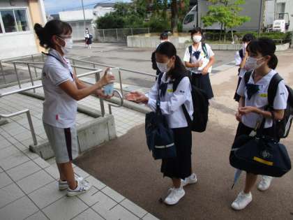 今朝は曇っていましたが、蒸し暑く感じました。玄関では手指の消毒を行っています。今日の下校完了時間は16:30です。