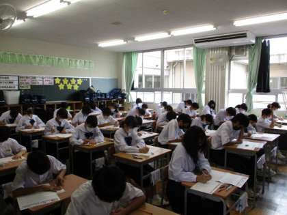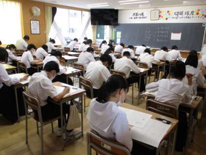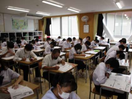 1、2年生は1〜2限に、3年生は1〜4限に確認テスト(夏休み明けテスト)を行いました。写真は上から14H、28H、31Hの様子です。