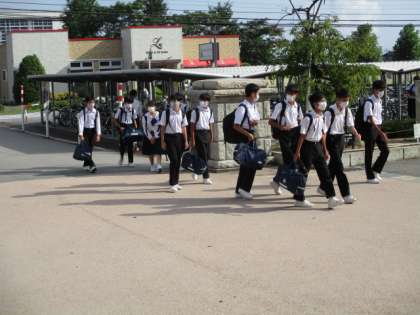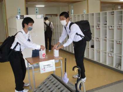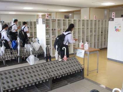 今朝も蒸し暑く感じました。生徒は生徒玄関での手指の消毒をしっかり行っています。今日の下校完了時間は17:30です。