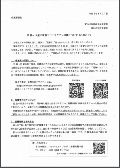 ※8月27日(金)に生徒を通じて「12歳〜15歳の新型コロナワクチン接種について(お知らせ)」(富山市保健所地域健康課・富山市学校保健課発)を配布しました。