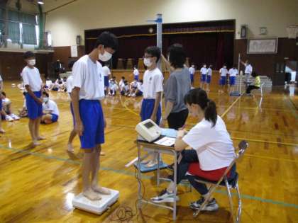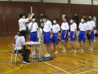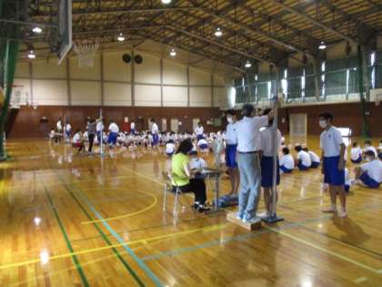 今日は全学年で発育測定を行いました。写真は2限の体育館の様子です。2年生男子が身長と体重を測定しています。1学期からどれだけ身長が伸びたでしょうか。