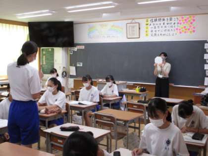 同じ時間帯の教室では女子が視力測定を行っています。後半は体育館へ行き、男子と交代します。