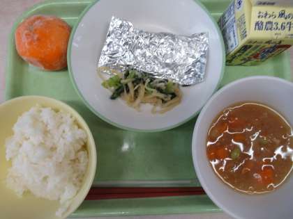 冬瓜の吉野煮は、とろみがついていて、口の中で甘い味が広がりました。さばの銀紙焼きは、みそがおいしく、ごはんが進みました。冷凍みかんは、シャーベットのようになっていて、おいしかったです。   給食委員長 出戸
