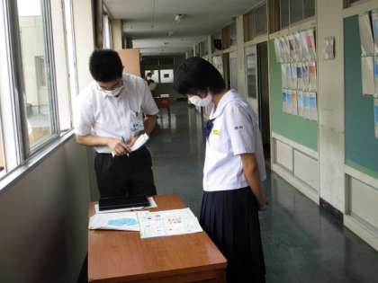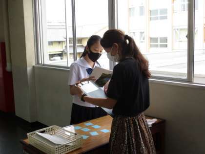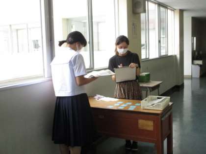 3限11Hと12Hの英語の様子です。生徒一人一人が廊下に出て先生の前でリーディングしています。
