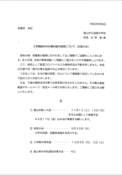 【9/6配布】2学期前半の行事日程の変更について(お知らせ)