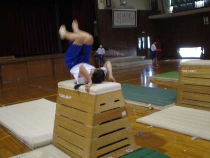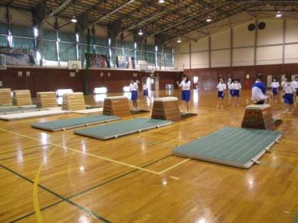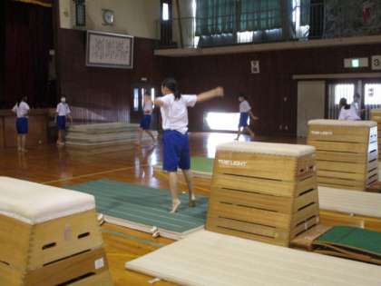 2限の体育館、24H・25H女子の体育の様子です。跳び箱の上で前転を行います。練習を重ねるとともに、少しづつ上達していました。