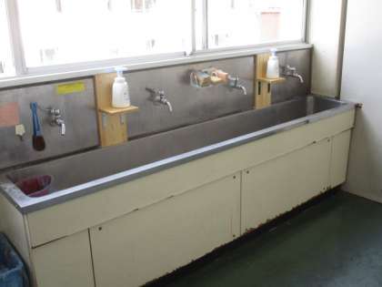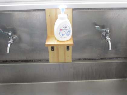 B棟の各階の手洗い場にハンドソープを置くための台が設置され、とても使いやすくなりました。しっかりと手洗いを行いましょう。