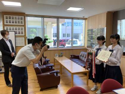 NHK放送コンテスト全国大会テレビ部門で最優秀賞をとった演劇部に新聞社から取材の依頼がありました。9月6日月曜日に校長室で取材を受ける代表の二人です。今週中に北日本新聞に掲載される予定です。楽しみです。