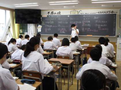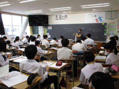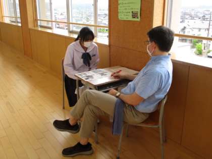写真は上から34H英語、35H社会、36H美術です。英語は廊下でALTの先生と一人一人の生徒が順に英語で会話しています。