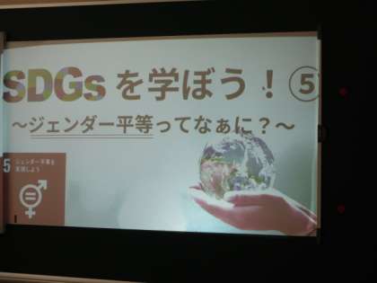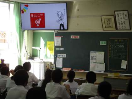 朝学活後の速中タイムでは1学期に続いて生徒会企画によるSDGsを学ぼう!を行いました。今日のテーマは「ジェンダー平等」でした。教室のモニター画面と放送を通して学びます。