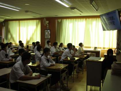 生徒は皆、真剣に学んでいます。放送室では、執行部の生徒が放送で進行しています。終わると各教室から拍手が起こりました。