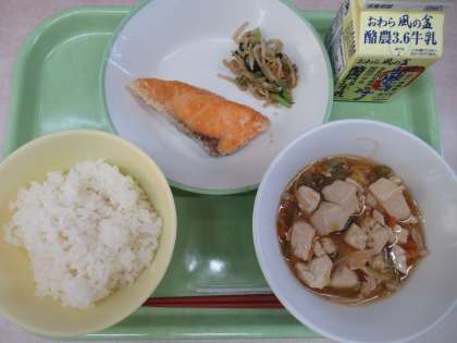 ごはん 牛乳 豆腐の野菜あんかけ 鮭のから揚げ 小松菜ともやしの香味和え