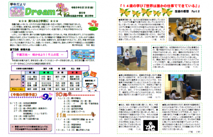 2学年だより第5号をアップしました。内容は、学年主任の巻頭言、体育大会の団リーダーとデコレーション係の紹介、「14歳の学び『世界は誰かの仕事でできている』」生徒作文、「2学期に向けて」生徒作文、金沢校外学習について、今後の行事予定です。