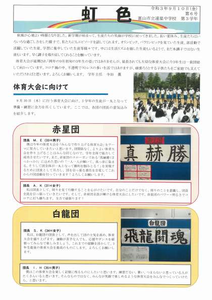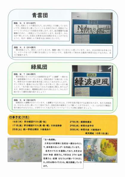 3学年だより第6号をアップしました。内容は、学年主任の巻頭言、体育大会に向けた各団団長の意気込み、9月の行事予定です。