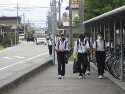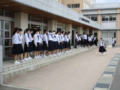 今朝は少し肌寒く感じました。玄関では女子卓球部があいさつ運動をしています。今日の下校完了時間は18:00です。