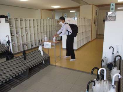 今朝はさわやかな快晴になりました。科学部の生徒があいさつ運動を行っています。今日の下校完了時間は18:00です。