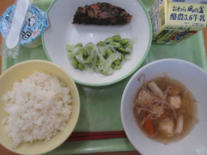 ごはん 牛乳 豆腐スープ 枝豆のマリネ ふくらぎのえごま揚げ ヨーグルト