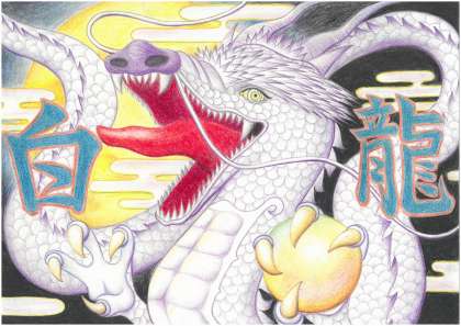 今年の白龍団のスローガン「飛龍闘魂」をもとに力強く空を飛ぶ龍を描きました。手に持っている玉や背景の雲に様々な色を取り入れることで白い龍を鮮やかに引き立てるよう工夫しました。大きく口を開けて迫力を出すことを意識しています。階級の高い龍は手に玉をもっていると言われており、高みを目指していきたいという願いを込めて、手に玉をもった龍を描きました。