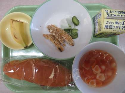 トマトスープは、トマトの酸味が程よく、パンに合っていました。きびなごのサクサク揚げは、天かすのようなサクサクとした衣がとてもおいしかったです。 給食委員長 出戸