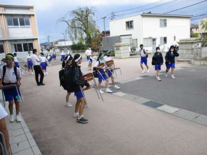 今日は体育大会の予行練習を行います。グラウンドで学年ごとの朝礼があるため椅子を持って移動している生徒も見られます。今日の下校完了時間は17:00です。