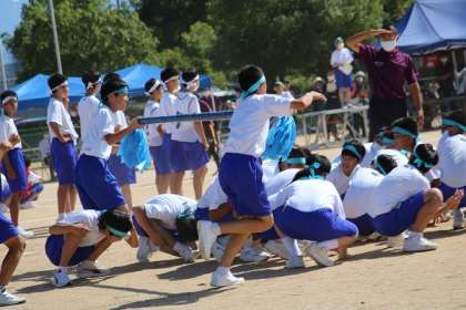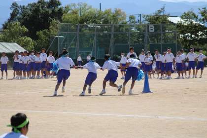 1年生の団体種目は「速中ハリケーン」です。特に回転地点では4人の息をぴったり合わせることが大切です。