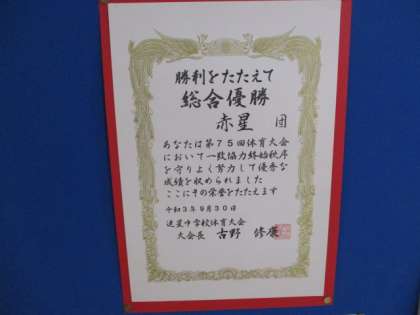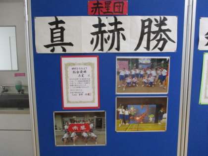 昨日行われた体育大会の掲示が賞状や写真を加え、新たになりました。写真は総合優勝した赤星団です。
