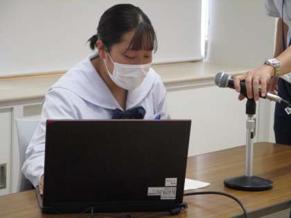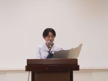 5限に前期生徒会の活動報告会、後期生徒会役員の任命証付与式、実践委員長委嘱状付与式を行いました。生徒は教室のモニターを見ながら参加します。まず前期の生徒会執行部、実践委員長から前期の活動を振り返って報告がありました。次に前期生徒会長からのあいさつがありました。