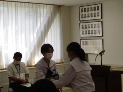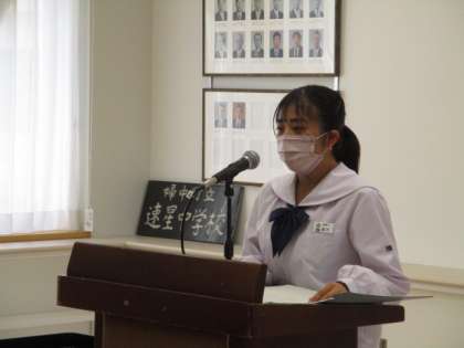 認証式後、前期執行部と後期執行部が引継ぎをしました。その後、新生徒会長があいさつを行いました。よりよい速中をつくるために生徒全員の協力を呼びかけました。