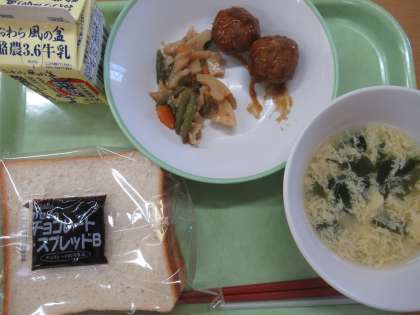 食パン 牛乳 チョコクリーム ミートボール れんこんソテー 卵とコーンのスープ