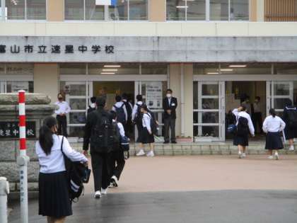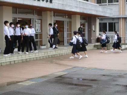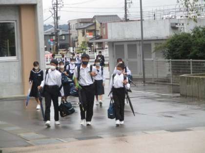 今朝は小降りの雨になりました。生活向上委員会の生徒があいさつ運動を行っています。今日の下校完了時間は16:55です。