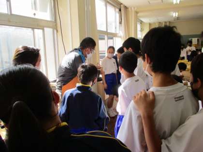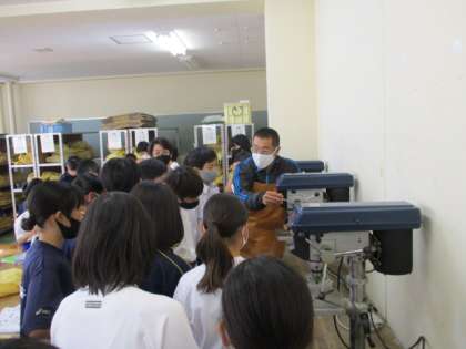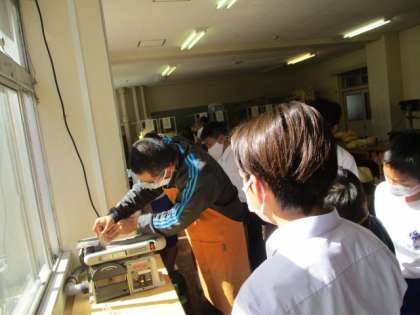 4限、11Hの技術の様子です。木材を加工をして、物や本を置くラックを製作します。生徒たちは先生から工作機械を用いた切削や穴あけについて真剣に説明を聞いていました。