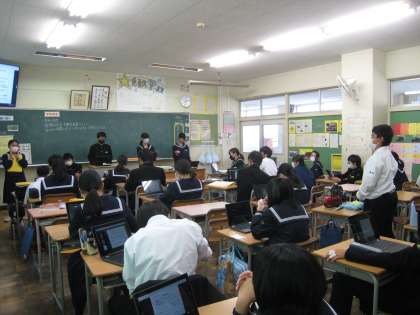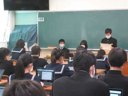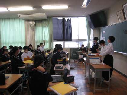 14H、15H、16Hの写真です。学級討議では、委員が自分の委員会の活動計画の説明をします。他の生徒は、説明をきいて、それをもとに後期の活動について意見や質問をします。
