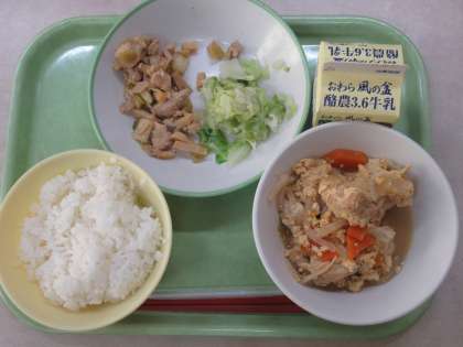 ごはん 厚揚げの錦とじ ゆでキャベツ あっさりチキン 牛乳