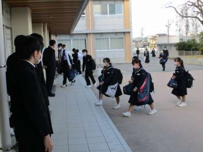 今日は秋晴れですがすがしい朝になりました。玄関前のもみじの葉も紅葉しています。今日の下校完了時間は17:30です。